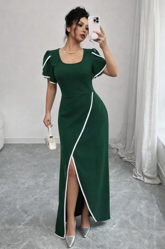 Kadın askılı geniş v yakalı sırttan bağlamalı yırtmaçlı süprem elbise
