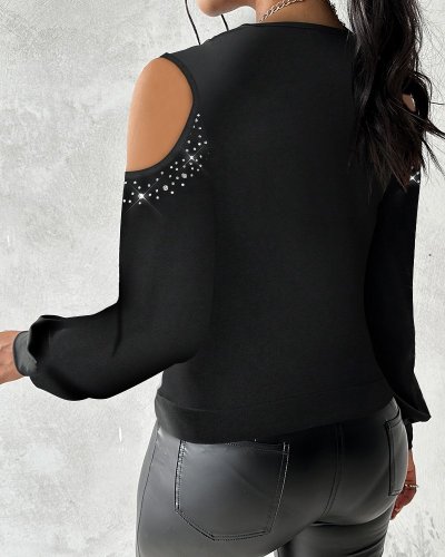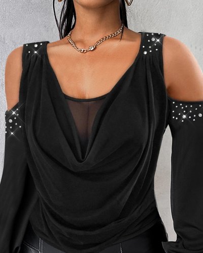 • Kadın uzun kollu omuz dekolte ve taş detaylı degaje tüllü yaka sandy bluz