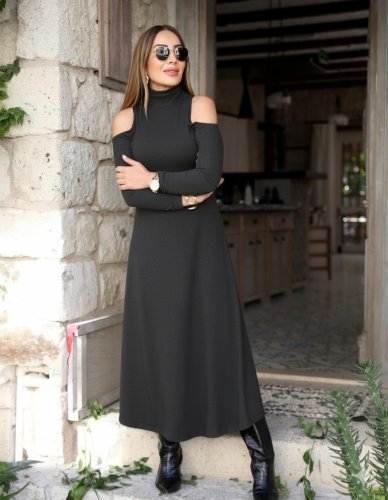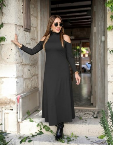 Kadın balıkçı yaka omuzlardan açık uzun kollu janjan krep elbise