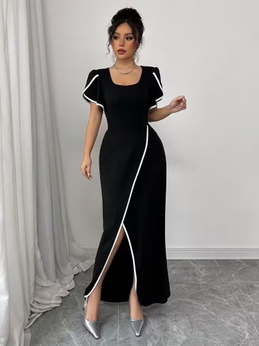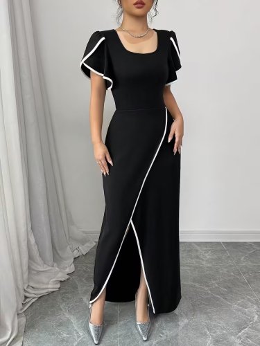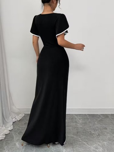 • Kadın kısa kollu kare yakalı önden çapraz kesim detaylı krep elbise