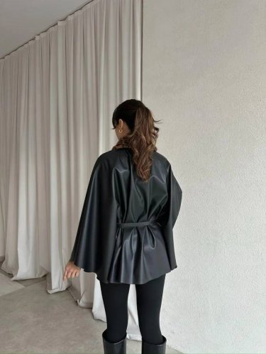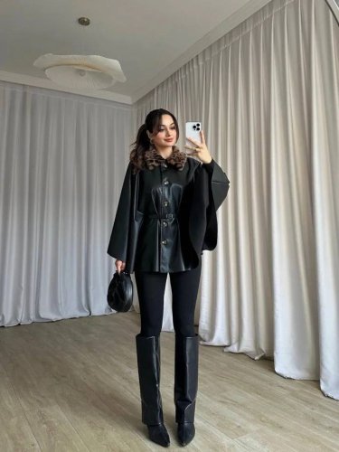 • Kadın uzun kollu leopar yaka detay kuşak dahil deri panço
